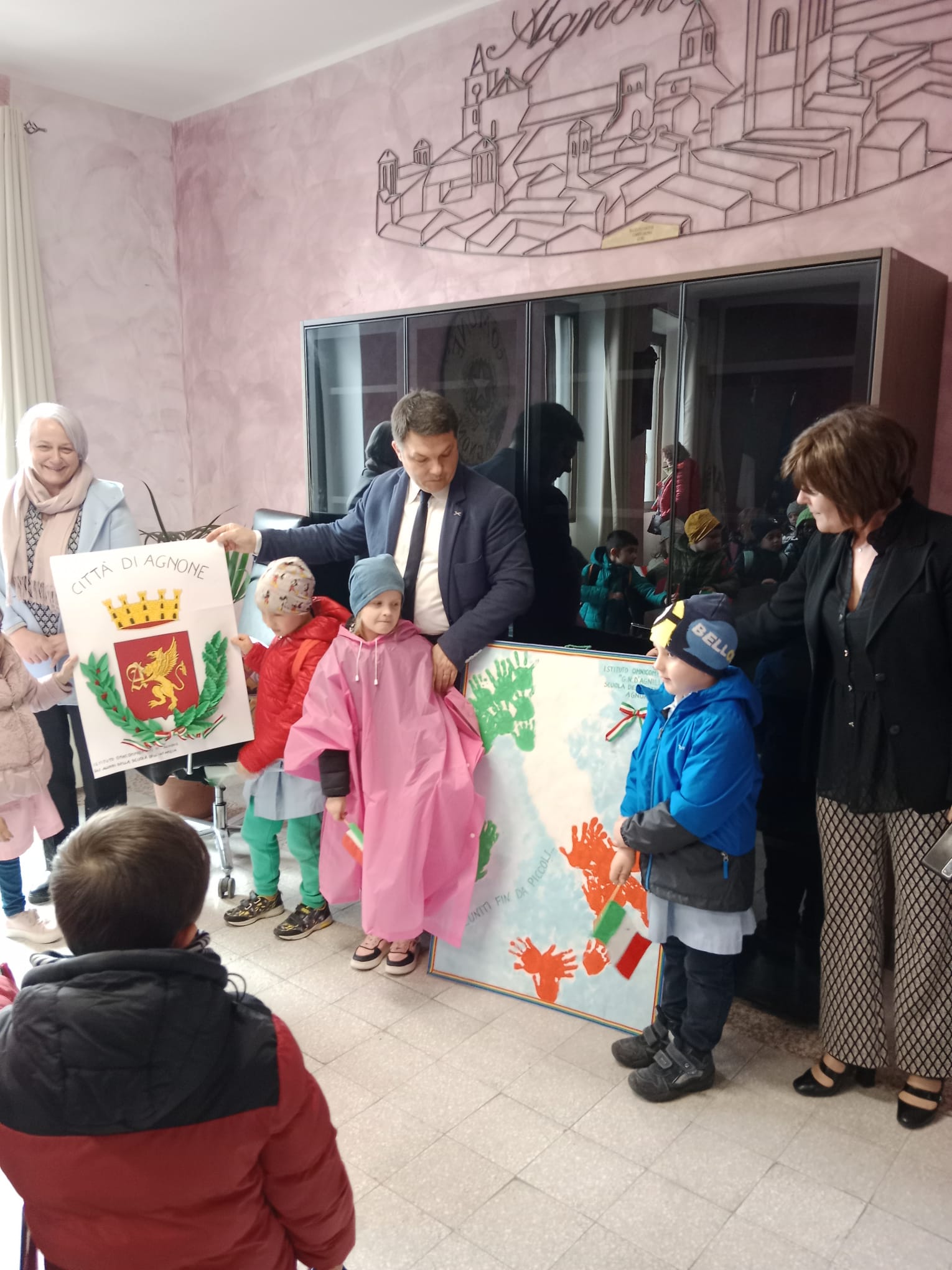 “I piccoli alunni – hanno spiegato le maestre – sono stati concentrati e hanno interagito brillantemente con il sindaco e il suo gruppo di lavoro, intervenendo con domande pertinenti. I piccoli cittadini hanno omaggiato il sindaco Saia con dei piccoli doni, realizzati durante le attività di educazione civica, rappresentanti il simbolo identitario di Agnone e un cartellone con l’Italia  realizzata con le impronte delle manine a significare che l’ unione fa la forza sin da piccoli. A coronamento di questa magica mattinata, bambini e adulti si sono uniti in coro per cantare l’ inno d’ Italia”.