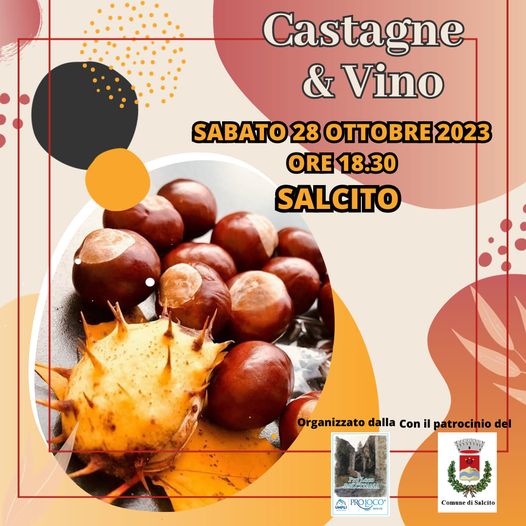 Castagne e Vino, a Salcito oggi sabato 28 ottobre 2023, dalle ore 18.30. La Proloco Salcitana, con il Patrocinio del Comune di Salcito, organizza la manifestazione “Castagne e Vino”, presso Piazza Pietravalle. Tutti sono invitati a prendere parte ad una delle iniziative tipiche del periodo, alle porte della stagione invernale. La Proloco locale invita i residenti e visitatori a trascorrere una serata all’insegna del relax e della cucina locale con prodotti tipici.