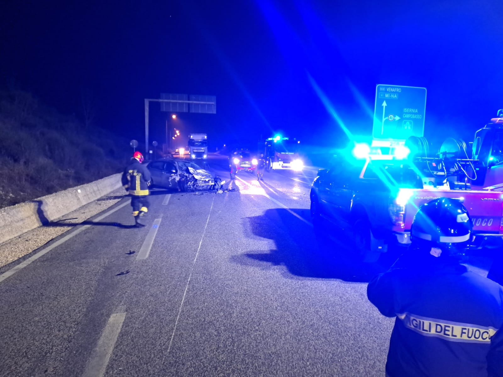 È di un morto e due feriti gravi il bilancio del tragico incidente stradale avvenuto stasera sulla Statale 652 a Rionero Sannitico, all’altezza dello svincolo per Castel di Sangro. Tre le auto coinvolte, due completamente accartocciate. A perdere la vita il 62enne Giacomo Iacobucci, di Rionero Sannitico, ex assessore del comune in provincia di Isernia dal 2009 al 2014. Gravemente feriti altri due giovani di otigini romane trasferiti in ospedale dal 118 in codice rosso. Secondo una prima ricostruzione, una delle auto diretta a Castel di Sangro avrebbe invaso l’altra corsia. Sul posto I carabinieri della compagnia di Castel di Sangro coadiuvati dai colleghi del Comando provinciale di Isernia e i vigili del fuoco di Castel di Sangro e Isernia.