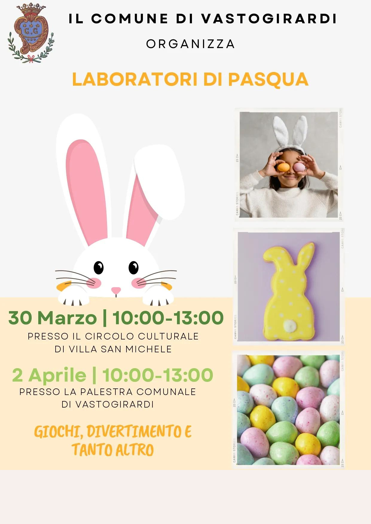 Una Pasqua di dolcezza, fantasia, giochi e tanto divertimento per i bambini di Vastogirardi (IS): l’amministrazione comunale ha organizzato due laboratori creativi dedicati ai più piccoli. Il primo si svolgerà domani, sabato 30 marzo dalle 10.00 alle 13.00 negli spazi del Circolo Culturale di Villa San Michele, il secondo martedì 2 aprile dalle 10.00 alle 13.00 nella Palestra Comunale di Vastogirardi. Due occasioni per celebrare le festività pasquali in maniera coinvolgente ed inclusiva stimolando l’ingegno e l’immaginazione ed incoraggiando l’apprendimento dei bambini, per aiutarli a scoprire il loro lato artistico. Non mancherà il momento goloso e conviviale della distribuzione delle uova di Pasqua.