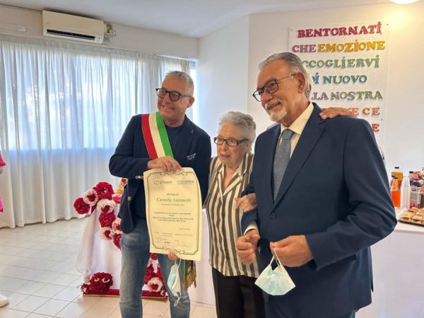C’era anche il Sindaco Nicola Balice per festeggiare Carmela Antonetti con il presidente della struttura Bruno Verini e il dottor Vincenzo Iannaccone direttore sanitario della struttura.