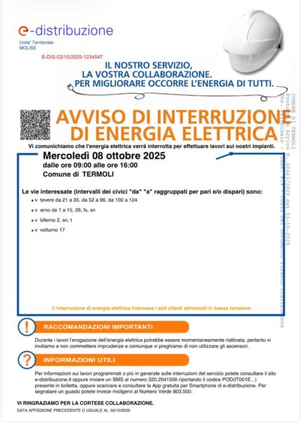 E-distribuzione comunica l’interruzione dell’energia elettrica a Termoli, per domani, 8 ottobre, dalle ore 9.00 alle 16.00.