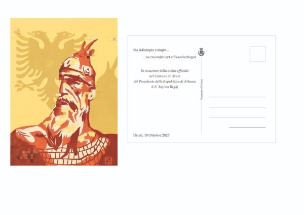 In occasione della visita ufficiale del Presidente della Repubblica di Albania, è stato realizzato un annullo filatelico commemorativo con timbro e cartolina dedicati a Giorgio Castriota Scanderbeg, opera dell’artista Marco Di Prisco. La cartolina racchiude un pensiero profondo dedicato alle nostre origini e sintetizzato perfettamente dalle operatrici del nostro sportello linguistico Maria De Rosa e Pinuccia Campofredano. Le cartoline saranno affrancate con i francobolli arbëreshë di Piana degli Albanesi, simbolo di un legame profondo e condiviso tra le nostre comunità. L’iniziativa, realizzata con la collaborazione di Poste Italiane, celebra una giornata storica per la nostra comunità e un ponte di amicizia tra l’Albania e la tradizione arbëreshe in Italia.
