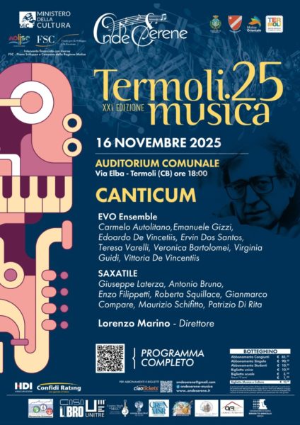 L’associazione servizi culturali “Ondeserene” è lieta di invitare al concerto della XXI edizione di Termoli Musica 25 Canticum, con l’Ensemble vocale EVO e l’Ensemble Saxatile diretti dal M° Lorenzo Marino, oggi pomeriggio, 16 novembre, alle ore 18.00 presso l’Auditorium di via Elba a Termoli. Il programma prevede musiche di G. Laterza, L. Berio.