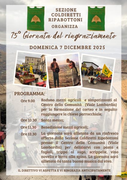 Si terrà a Ripabottoni la 75ª Giornata del Ringraziamento promossa dalla Sezione Coldiretti locale: un appuntamento che unisce mondo agricolo, comunità e spiritualità per dire grazie alla terra e invocare un nuovo ciclo di lavoro fecondo.