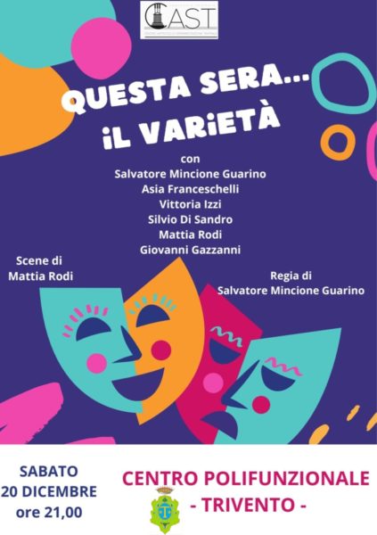 L’Amministrazione Comunale di Trivento, nell’ambito delle manifestazioni promosse per il periodo natalizio, propone una serata di teatro, musica e divertimento con lo spettacolo “Questa sera… il varietà”, regia di Salvatore Mincione Guarino, a cura della compagnia teatrale CAST, pensato per regalare al pubblico momenti di leggerezza e allegria. L’appuntamento è per Sabato 20 dicembre alle ore 21:00 al Centro Polifunzionale comunale. L’ingresso è libero.