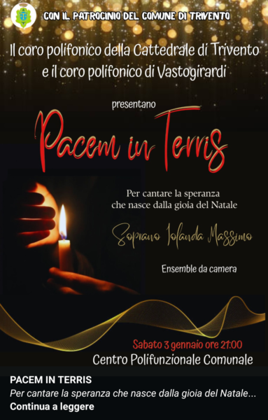 Pacem in Terris, il concerto a Trivento con il soprano Iolanda Massimo. Sabato 3 gennaio 2026, con inizio alle ore 21.00, presso il Centro polifunzionale comunale di Trivento, su corso Beniamino Mastroiacovo, si terrà il concerto “Pacem in Terris”, presentato dal Coro polifonico della Cattedrale di Trivento e il Coro polifonico di Vastogirardi. Il Comune di Trivento ha dato il patrocinio. Ospite d’onore della serata, organizzata per cantare la speranza che nasce dalla gioia del Natale, è il soprano Iolanda Massimo, una delle voci più belle e apprezzate, non solo sul palcoscenico nazionale.