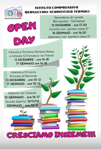 Appuntamento con l’open day, oggi pomeriggio a Termoli, presso la scuola secondaria di I grado Bernacchia-Schweitzer, alle 16.30 che accoglierà gli alunni delle classi quinte con laboratori didattici pensati per favorire un primo approccio alla scuola secondaria. Nella giornata di domani, invece, sono previsti altri appuntamenti, con un open day presso la scuola dell’infanzia e primaria di Principe di Piemonte dalle 10.00 alle 12.00 e nel pomeriggio dalle 16.00 alle 18.00, ci sarà l’open day presso la scuola dell’infanzia, la scuola primaria di Pantano Basso e presso la scuola dell’infanzia San Francesco, in via Tremiti.