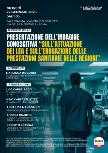 Si terrà domani, giovedì 22 gennaio, alle 11:30, presso la Sala Stampa della Camera dei deputati in via della Missione 4 a Roma, la presentazione dell’indagine conoscitiva sull’attuazione dei LEA e sull’erogazione delle prestazioni sanitarie nelle Regioni, promossa dal Comitato Enti Locali del Movimento 5 Stelle, coordinato dal consigliere regionale Roberto Gravina, insieme al Comitato Salute M5S.