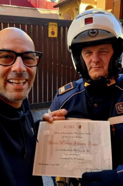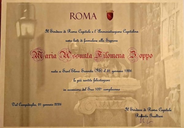 Una pergamena ufficiale firmata dal sindaco di Roma, Roberto Gualtieri e consegnata ufficialmente da una pattuglia in moto della Polizia Locale della Capitale, in occasione del traguardo dei 100 anni per Maria Assunta Filomena Zoppo, nata il 31 gennaio 1926 a Sant’ Elena Sannita dove ha vissuto