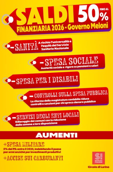 Ai manifesti contro la manovra finanziaria, comparsi in questi giorni a Larino, seguiranno altre iniziative di volantinaggio e di sensibilizzazioni del locale circolo di SI che si concluderanno con un evento pubblico aperto alla cittadinanza.