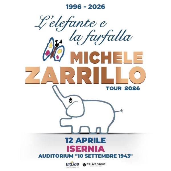 Il tour “1996 – 2026 L’elefante e la farfalla” prenderà il via il 28 marzo da Fondi e toccherà alcune delle principali città italiane, celebrando un brano capace di emozionare e unire generazioni diverse, diventato nel tempo un vero classico della canzone d’autore italiana. Domenica 12 aprile tappa a Isernia dove Zarrillo si esibirà all’Auditorium “10 settembre 1943”. I biglietti per lo spettacolo saranno in prevendita dalle 15 di oggi, giovedì 5 febbraio, su Ciaotickets e nei punti vendita abituali.