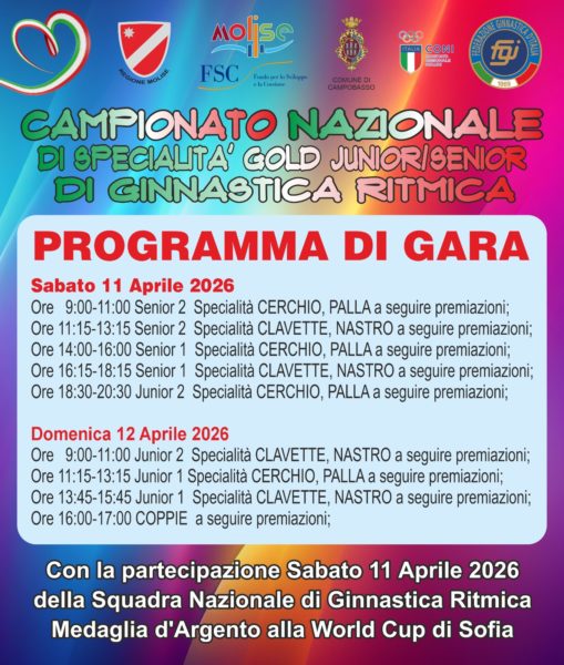 Campobasso ed il Molise tutto faranno ancora una volta rima con i colori azzurri. Nella prima giornata delle due di competizione ai campionati italiani di specialità ‘Gold’ junior e senior di ginnastica ritmica in programma sabato 11 e domenica 12 aprile presso ‘La Molisana Arena’ a Campobasso ci sarà spazio anche per la nazionale italiana di ginnastica ritmica, le ‘farfalle’ così come sono conosciute nell’ambiente reduci dalla medaglia d’argento nella prova di World Cup a Sofia in Bulgaria.