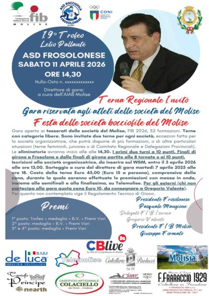Frosolone si prepara ad accogliere uno degli appuntamenti più attesi del calendario boccistico: il 22° Trofeo Città di Frosolone – 19° Trofeo Lelio Pallante. La competizione, dedicata allo storico editore di Telemolise ed ex sindaco del paese, si svolgerà sabato 11 e domenica 12 aprile con numeri di rilievo.