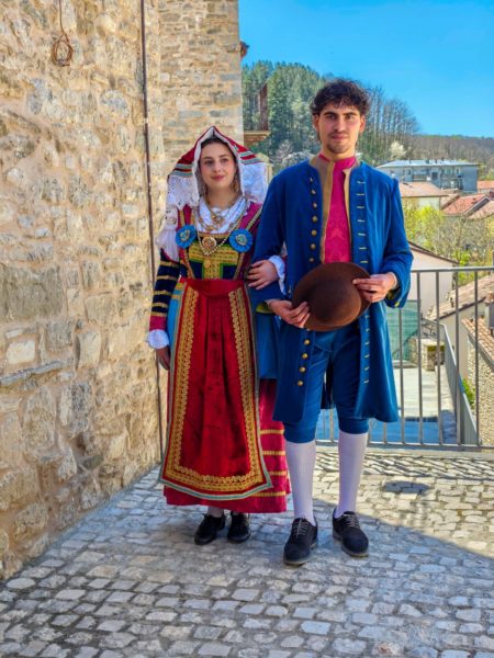 I costumi, mai ritrovati a causa delle distruzioni della Seconda Guerra Mondiale, sono stati ricreati con rigore grazie al contributo di Antonio Scasserra, direttore del MUVES – Museo delle Vestimenta di Campobasso, sulla base di documenti notarili e iconografie dell’epoca borbonica. Il risultato è una restituzione fedele e ricca di significato: rosso dominante per l’abito femminile, simbolo delle donne sposate, e indaco per quello maschile, impreziositi da tessuti, ricami e gioielli tradizionali.