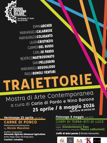TRAIETTORIE riunisce dieci artiste contemporanee – Emma Archer, Mariangela Calabrese, Mariagrazia Colasanto, Carmen Del Russo, Carla Di Pardo, Laura Cristinzio, Beatrice Mastrodonato, Sara Pellegrino, Mariangela Regoglioso, Paola Romoli Venturi – in un progetto espositivo che valorizza la pluralità di linguaggi e pratiche. Anche tre performer tra arte, scenografia, regia, coreografia e danza: Nicola Macolino, Giandomenico Sale e Marco Lattuchelli.