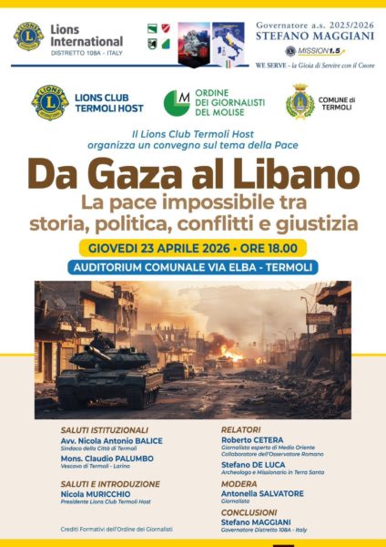 Il Lions Club Termoli Host, in collaborazione con l’Ordine dei Giornalisti del Molise, promuove un convegno di grande attualità dedicato al complesso tema della pace in Medio Oriente. In un momento storico segnato da escalation di tensioni e crisi umanitarie senza precedenti, l’iniziativa mira ad offrire una panoramica approfondita sulle dinamiche che ostacolano la riconciliazione nelle martoriate terre di Gaza e del Libano, intrecciando analisi storiche, prospettive politiche, resoconti di conflitti armati e riflessioni sulla giustizia internazionale.