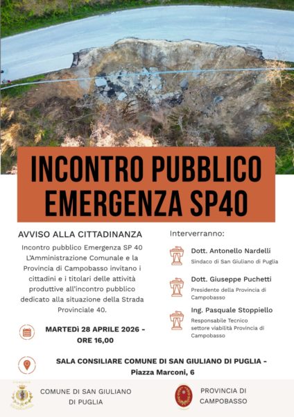 Incontro pubblico sull’emergenza della strada provinciale 40, interessata da un frana lo scorso 3 aprile e chiusa al traffico per motivi di sicurezza. L’appuntamento è per oggi pomeriggio, in sala consiliare ,a San Giuliano di Puglia, alle ore 16.00. Interverranno sul tema: il Sindaco di San Giuliano, Antonello Nardelli, il Presidente della Provincia di Campobasso Pino Puchetti e il Responsabile tecnico del settore della viabilità della provincia di Campobasso, l’Ingegnere Pasquale Stoppiello.